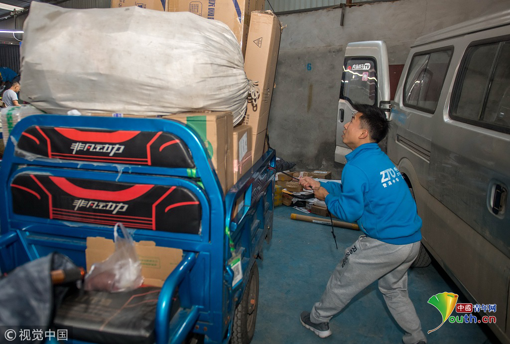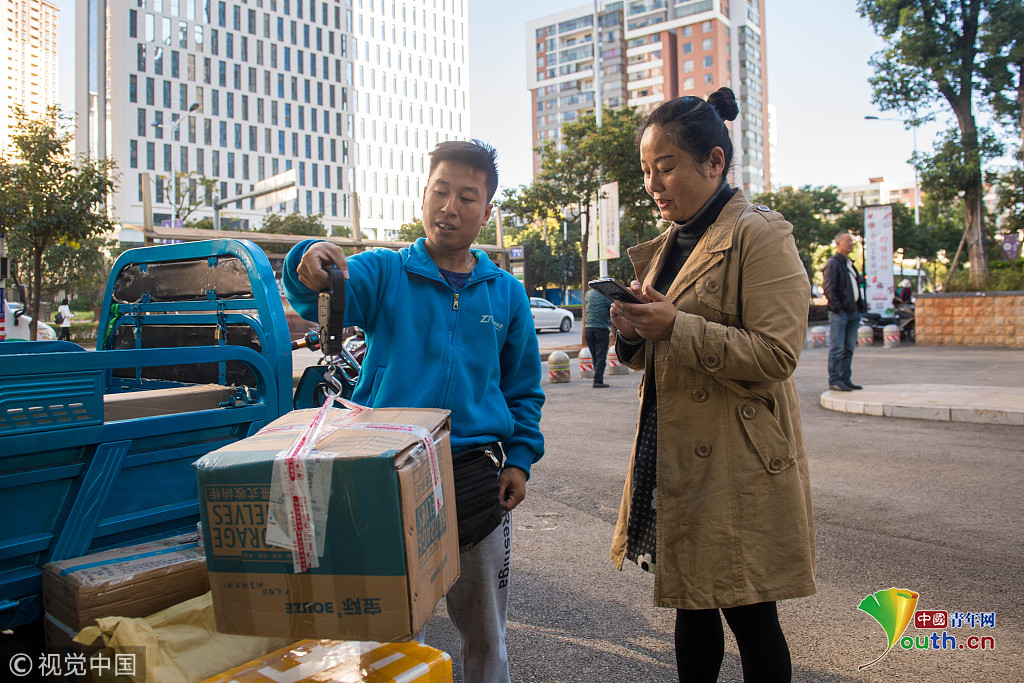 2018年10月16日,云南省昆明市,攝影師實(shí)拍90后快遞員熊忠桃的一天工作。作為一名快遞員,他25歲就買了房,9月份收入3萬(wàn)多。圖片作者:銳圖