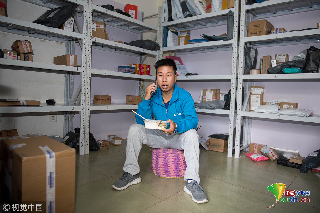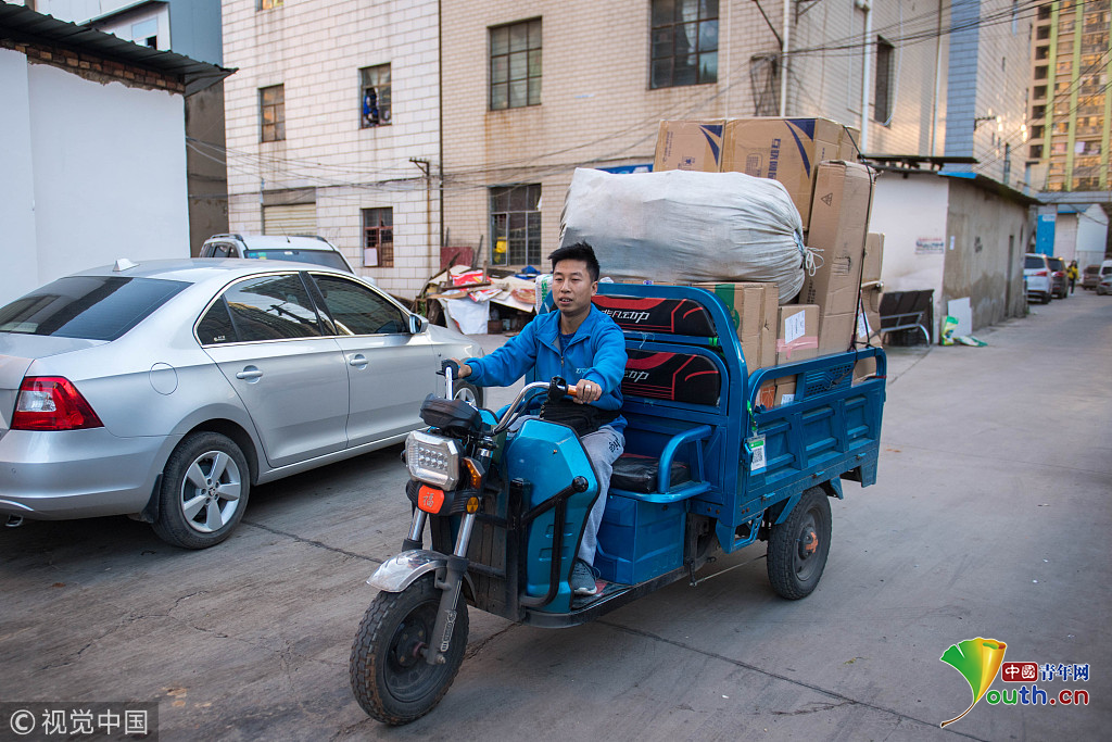 云南省昆明市,攝影師實(shí)拍90后快遞員熊忠桃的一天工作。作為一名快遞員,他25歲就買了房。圖片作者:銳圖