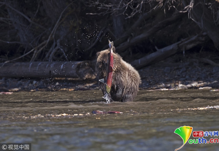 2018年10月29日訊(具體拍攝時間不詳),加拿大英屬哥倫比亞,一只15個月大的棕熊幼崽在Chilko Lake湖畔成功捉到一只4公斤重的紅色鮭魚。