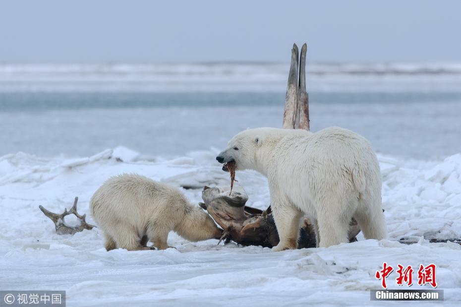 11月1日訊(具體拍攝時間不詳),美國阿拉斯加州,一只北極熊媽媽帶著幼崽們外出覓食,發(fā)現(xiàn)了一節(jié)長4.5米的北極露脊鯨骸骨。75噸重的鯨魚對因紐皮亞特人來說是神圣的,他們每年要吃三次鯨魚,把骨頭放在指定的地方,讓北極熊吃完粘在骨頭上的碎肉。攝影師Eiji Itoyama為拍攝此照片在位于北冰洋邊緣的阿拉斯加卡克托維克村停留了5天。圖片來源:視覺中國