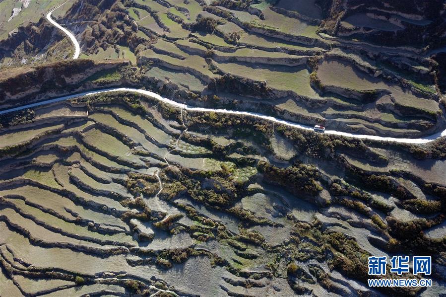 在隴南市武都區(qū)坪埡藏族鄉(xiāng),載有村民物品的搬遷車輛行駛在山間道路上(10月31日無人機拍攝)。新華社記者 范培珅攝