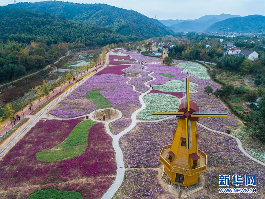 11月2日,空中俯瞰小浦鎮(zhèn)的“五彩花?!?,多彩的花海與金黃的銀杏林構(gòu)成了一幅美麗的秋季風(fēng)景(無(wú)人機(jī)拍攝)。 新華社記者 徐昱 攝