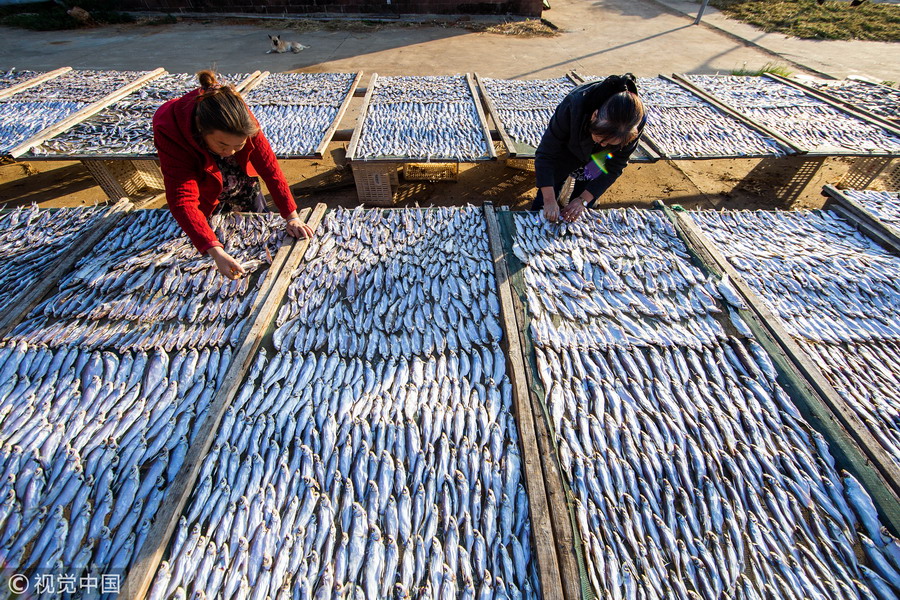 鄱陽(yáng)湖畔漁民趁秋光晾魚蝦慶豐收