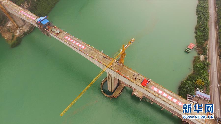 在重慶涪陵拍攝的渝懷鐵路涪秀二線重點工程——烏江右線大橋(10月23日無人機拍攝)。 10月23日,由中鐵四局承建的渝懷鐵路涪秀二線重點工程——烏江右線大橋主跨成功合龍,標志著大橋主體工程全部順利結束。烏江右線大橋項目全程460.1米,主跨192米,跨越烏江和319國道。在兩年多的建設過程中,施工人員攻克了“不等高墩”“不對稱邊跨”“邊跨入隧”等多個技術難題。 新華社記者王全超攝