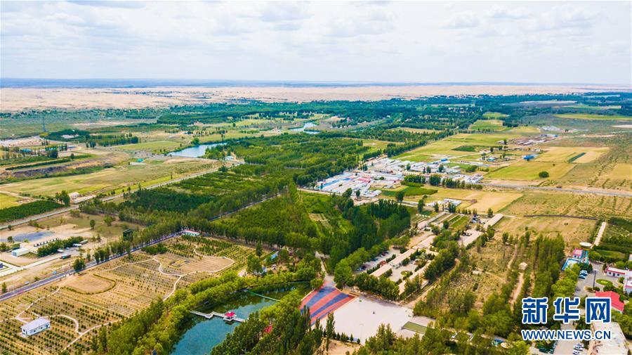 地處庫(kù)布其沙漠的恩格貝景區(qū)(6月8日無人機(jī)拍攝)。