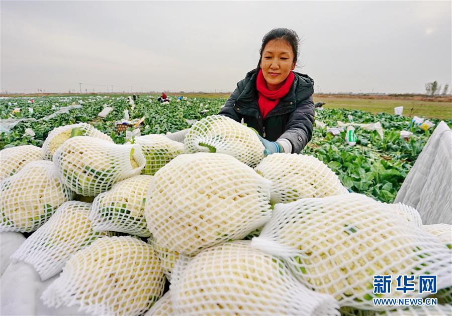 11月5日,唐山海港經(jīng)濟(jì)開(kāi)發(fā)區(qū)王灘鎮(zhèn)東高各莊村的菜農(nóng)將收獲的菜花裝車。 新華社記者 楊世堯 攝