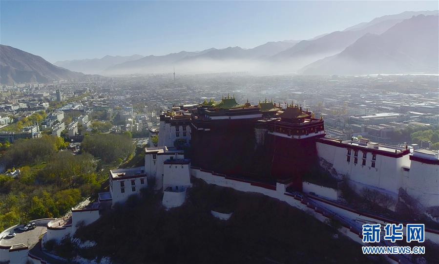 修繕后的布達拉宮金頂群(11月7日無人機拍攝)。