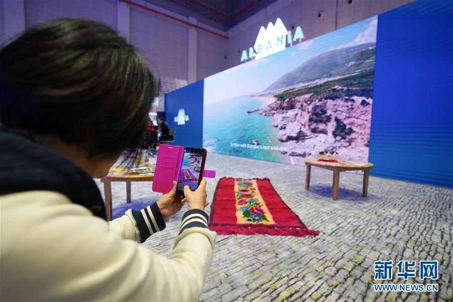 11月7日,在阿爾巴尼亞展區(qū),一名參觀者拍攝當?shù)厣a的地毯。 中國國際進口博覽會11月5日在上海開幕。國家貿易投資綜合展(國家展)是中國國際進口博覽會的重要內容,共有82個國家、3個國際組織設立71個展臺。 新華社記者 王天聰 攝