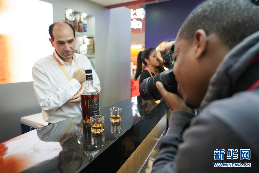 11月7日,在委內(nèi)瑞拉展區(qū),一名參觀者拍攝當?shù)厣a(chǎn)的朗姆酒。 中國國際進口博覽會11月5日在上海開幕。國家貿(mào)易投資綜合展(國家展)是中國國際進口博覽會的重要內(nèi)容,共有82個國家、3個國際組織設立71個展臺。 新華社記者 王天聰 攝