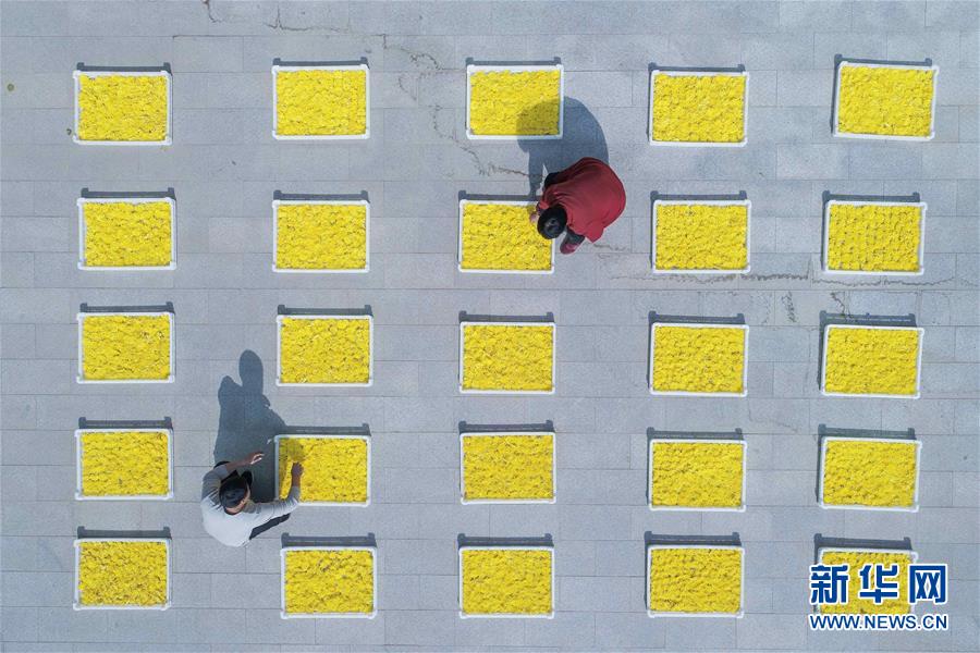 11月7日,河北省魏縣魏城鎮(zhèn)町上村農(nóng)民在分揀晾曬菊花(無(wú)人機(jī)拍攝)。 新華社記者 朱旭東 攝