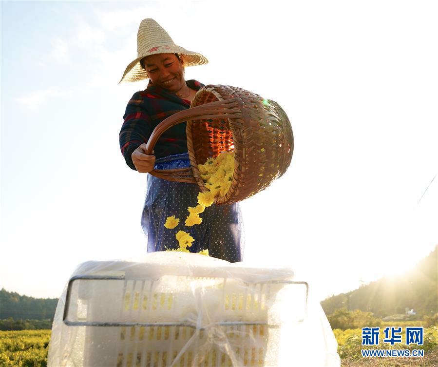 11月8日,婺源縣思口鎮(zhèn)農(nóng)戶將采摘好的皇菊收到筐中準備外運。新華社記者 胡晨歡 攝