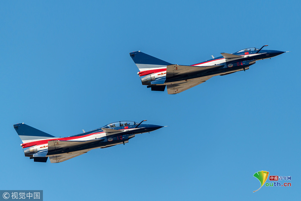 圖六:2018年11月6日,廣東珠海航展上,兩架八一飛行表演隊的殲-10A飛機。