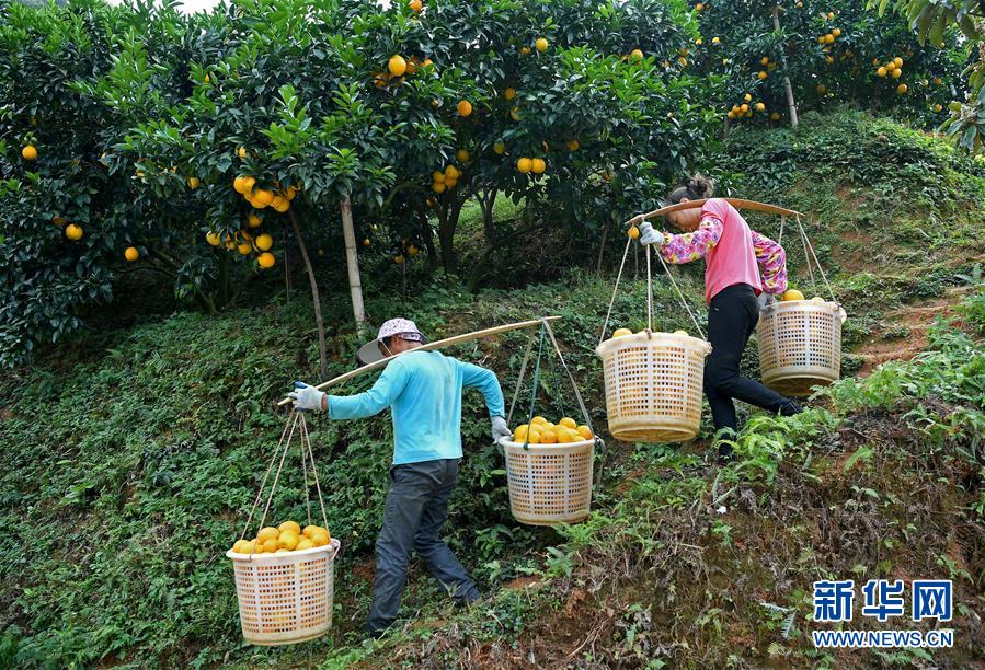 11月11日,江西省尋烏縣澄江鎮(zhèn)周田村的果農(nóng)在挑運(yùn)臍橙。
