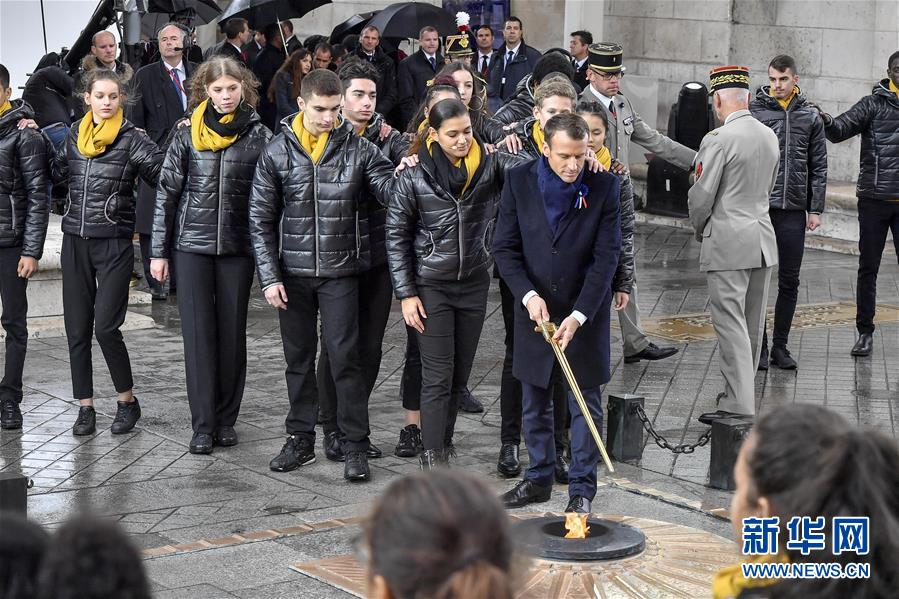 11月11日,在法國巴黎,法國總統(tǒng)馬克龍在紀念儀式上撥旺無名烈士墓的火焰。當日,法國政府在巴黎凱旋門前舉行儀式,隆重紀念第一次世界大戰(zhàn)結(jié)束一百周年。新華社記者 陳益宸 攝