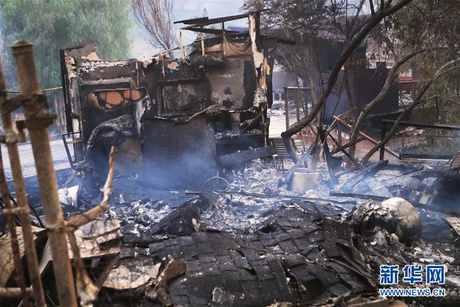 這是11月10日在美國加利福尼亞州馬里布市拍攝的一處被燒毀的廢墟。連日來,美國加利福尼亞州野火肆虐。 新華社記者李穎攝