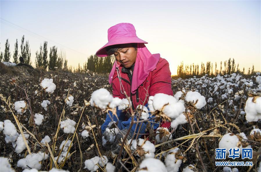 拾花工陳喜波在新疆巴楚縣多來提巴格鄉(xiāng)卡扎尼塔皮提村的棉田中(10月25日攝)。