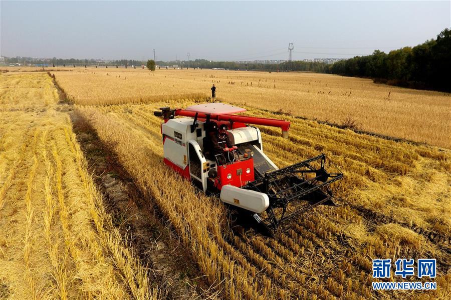 在太原市晉源區(qū)赤橋村,收割機在稻田里作業(yè)(10月17日無人機拍攝)。近日,山西省太原市晉源區(qū)2000多畝水稻迎來收割季。 金秋時節(jié),農民們忙著收獲成熟的農作物,喜迎豐收。 新華社記者 詹彥 攝
