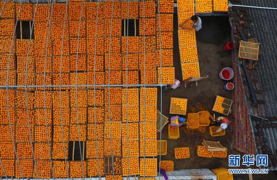10月17日,廣西桂林市平樂縣沙子鎮(zhèn)渡河村農民在晾曬柿子(無人機拍攝)。 金秋時節(jié),農民們忙著收獲成熟的農作物,喜迎豐收。 新華社記者 黃孝邦 攝