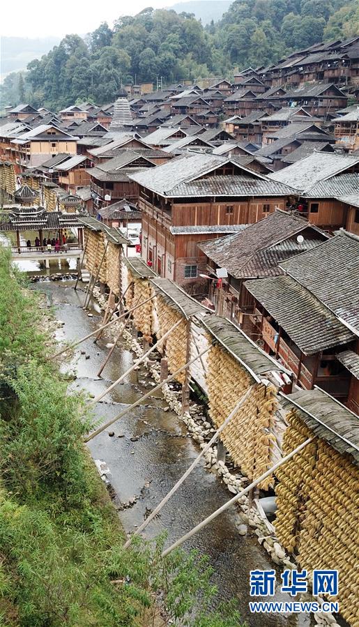 這是貴州省黔東南苗族侗族自治州從江縣高增鄉(xiāng)占里村一處屋檐下晾曬的稻谷(10月17日攝)。 金秋時節(jié),農民們忙著收獲成熟的農作物,喜迎豐收。 新華社記者陳曄華攝