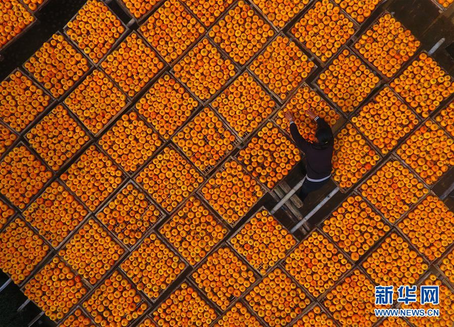 10月17日,廣西桂林市平樂縣沙子鎮(zhèn)渡河村農民在晾曬柿子(手機拍攝)。 金秋時節(jié),農民們忙著收獲成熟的農作物,喜迎豐收。 新華社記者 黃孝邦 攝