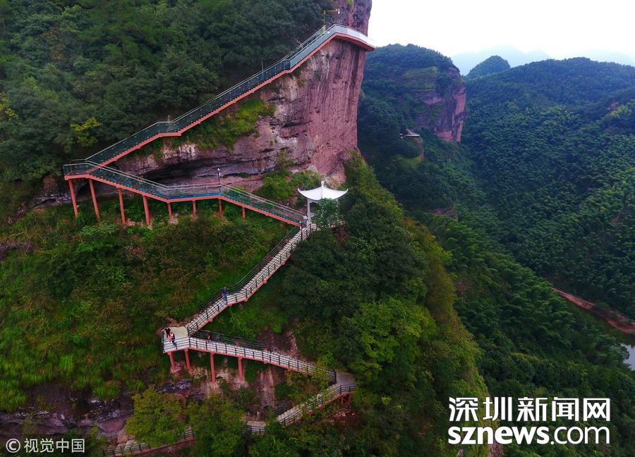 深圳新聞網(wǎng)訊 2018年6月19日,航拍江西贛州南武當山百米高空玻璃棧道。棧道緊貼峭壁,在懸崖之上凌空蜿蜒穿行,猶如一條玉龍盤旋在綠林石海之中。 南武當山位于江西最南端的龍南縣武當鎮(zhèn)境內(nèi),景區(qū)核心面積達到13.5平方公里,擁有99座千姿百態(tài)的巍峨石峰,丹霞地質(zhì)風貌突出,連綿十里,被稱為“武當十里畫廊”。