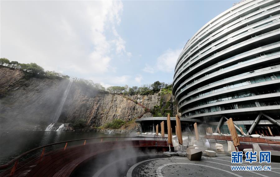 一條人造瀑布從酒店主體建筑旁的礦坑頂部流下(11月13日攝)。 位于上海松江的世茂洲際酒店11月15日正式開門營業(yè)。這家在一個廢棄采石礦坑內建成的酒店成為上海又一新景。 新華社記者 方喆 攝