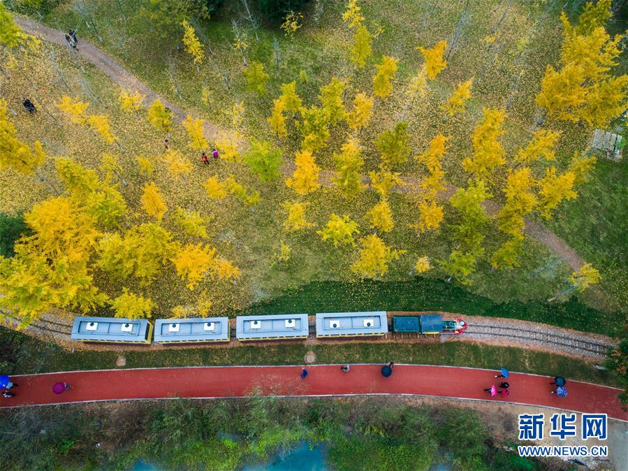一列觀光小火車帶著游客穿行在銀杏林里(11月16日無人機拍攝)。近日,在浙江省長興縣小浦鎮(zhèn),“十里銀杏長廊”和近千畝花海經(jīng)過近一年的升級改造后,以嶄新的面貌與游客見面。花海、觀光小火車、古村民宿、銀杏長廊等旅游項目全面提升了小浦鎮(zhèn)鄉(xiāng)村旅游的品質。新華社記者 徐昱 攝