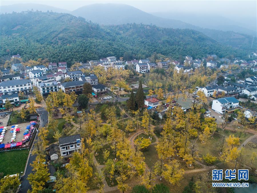 空中俯瞰十里銀杏林長廊(11月16日無人機拍攝)。近日,在浙江省長興縣小浦鎮(zhèn),“十里銀杏長廊”和近千畝花海經(jīng)過近一年的升級改造后,以嶄新的面貌與游客見面?;ê?、觀光小火車、古村民宿、銀杏長廊等旅游項目全面提升了小浦鎮(zhèn)鄉(xiāng)村旅游的品質。新華社記者 徐昱 攝