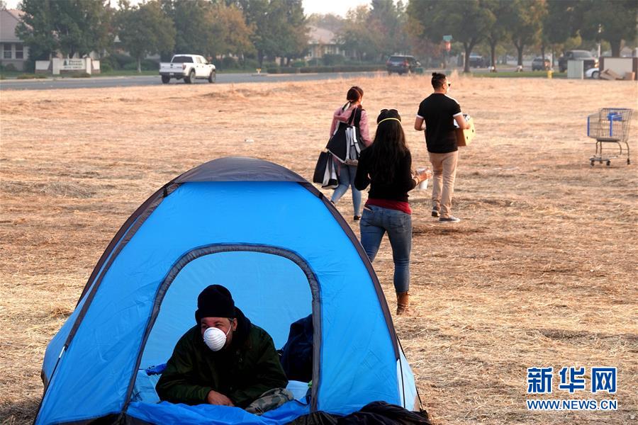 11月18日,在美國加利福尼亞州比尤特縣奇科,災(zāi)民在沃爾瑪停車場(chǎng)搭起帳篷暫居。  新華社記者吳曉凌攝