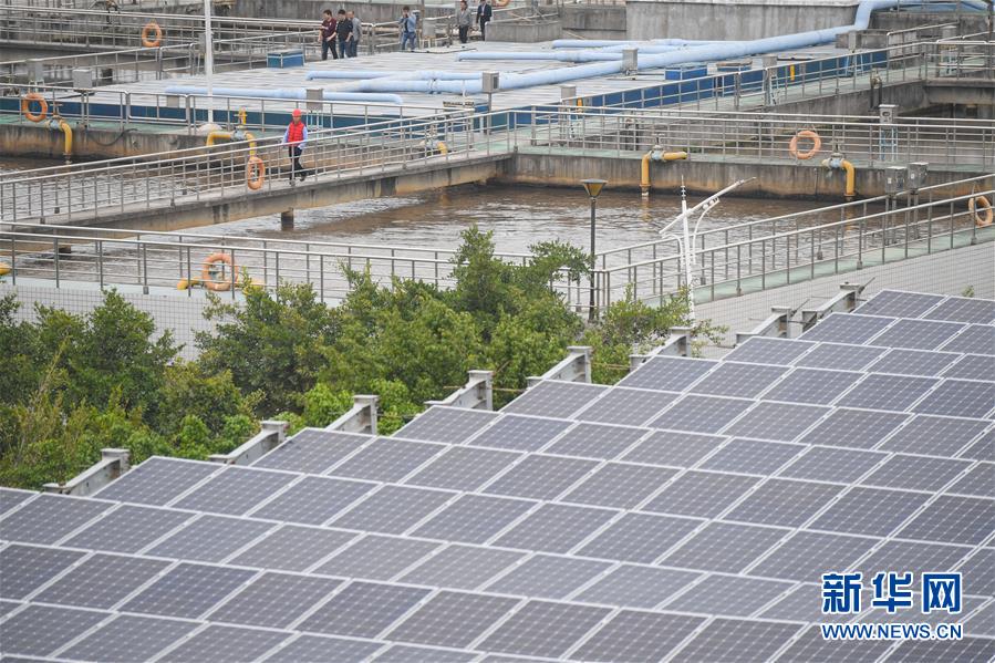 11月20日,在福建省石獅市中心區(qū)城市污水處理廠,工作人員從光伏發(fā)電板附近的污水處理池旁經(jīng)過。新華社記者 宋為偉 攝