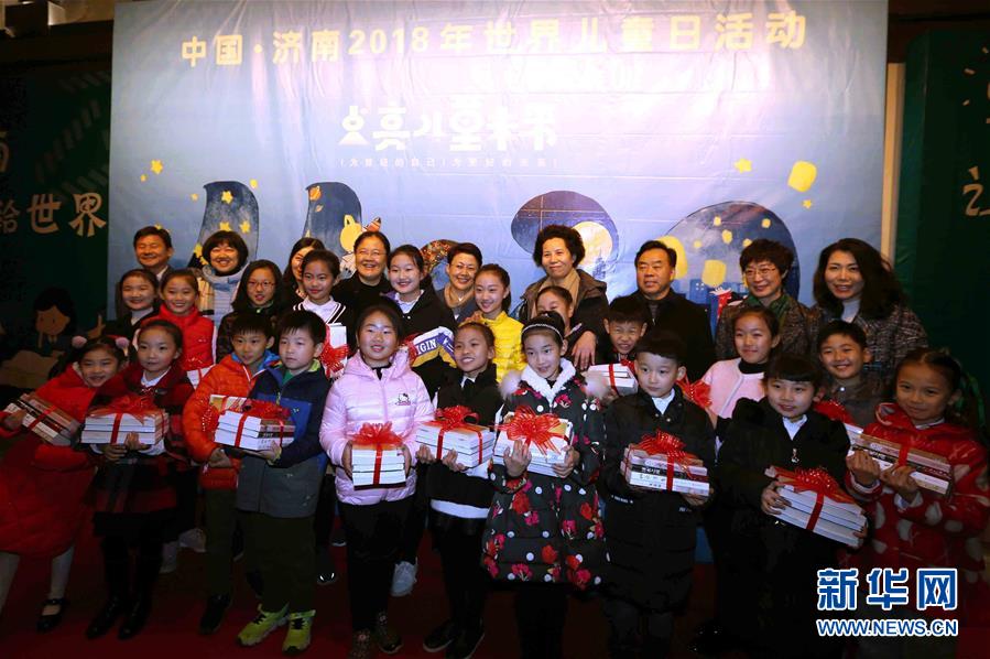 11月20日,在濟(jì)南舉行的世界兒童日主題活動上,孩子們拿著獲贈的經(jīng)典書籍合影留念。 新華社發(fā)(李俊卓攝)