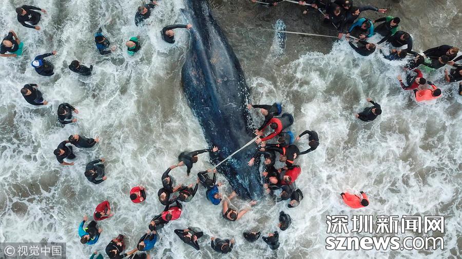 當地時間2018年4月9日,阿根廷馬德普拉塔,一條鯨魚在當地海灘擱淺,雖經民眾合力救助仍最終死亡。