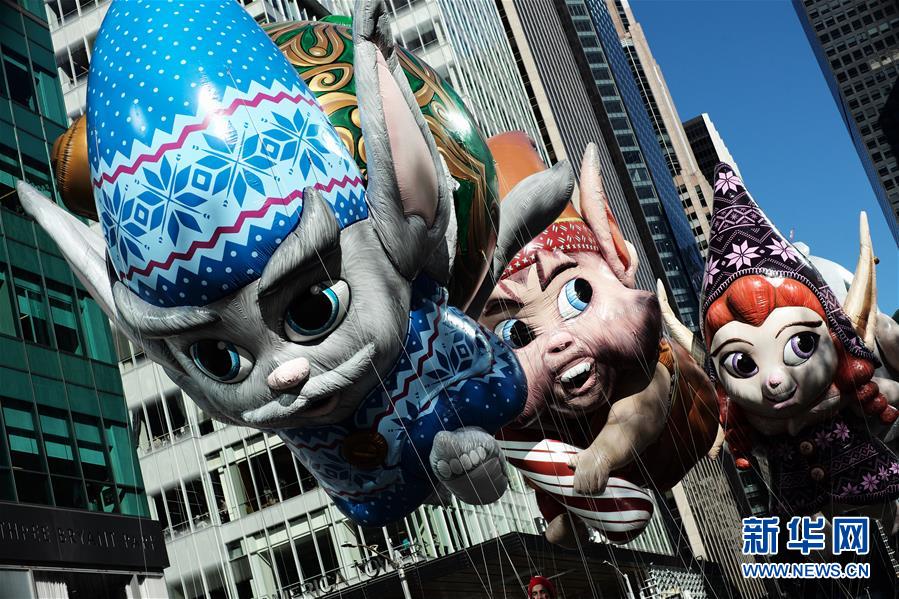 11月22日,在美國紐約感恩節(jié)大游行上,小精靈造型氣球行進在曼哈頓街頭。
