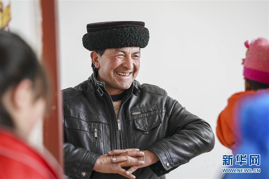 在塔什庫爾干塔吉克自治縣塔提庫力易地扶貧搬遷安置點的新房內(nèi),都熱·加爾曼與前來看望他的鄰居聊天(11月18日攝)。新華社記者胡虎虎攝