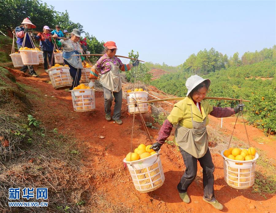 11月23日,于都縣新陂鄉(xiāng)的果農(nóng)在挑運臍橙。