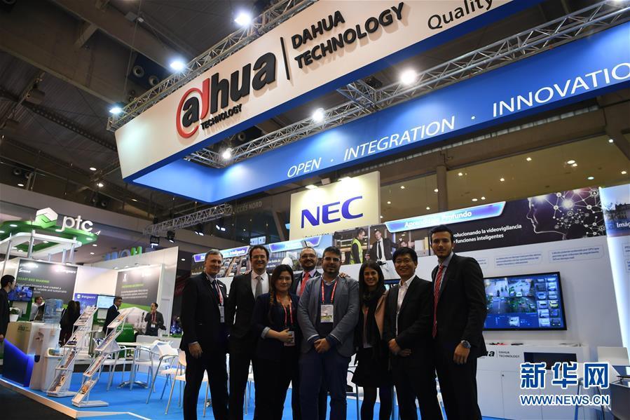 2017年11月15日,在巴塞羅那2017全球智慧城市博覽會上,浙江大華技術股份有限公司的中外員工在本公司展臺前合影。新華社記者郭求達攝