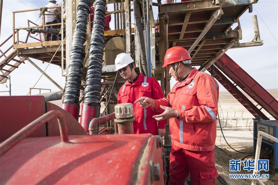 11月20日,在埃及明亞省,中曼石油埃及分公司總經(jīng)理李偉(左)在鉆井現(xiàn)場查看。 2017年,中國中曼石油公司與阿聯(lián)酋海灣集團簽訂合同,為該集團在埃及沙漠中的大型農(nóng)業(yè)項目鉆探300口水井。根據(jù)合同,中曼石油將先期完成30口井的試鉆探,剩余水井將以每月7口的速度交付。目前有超過200名工人在鉆井現(xiàn)場作業(yè),大部分是埃及本地人。 新華社記者李碧念攝