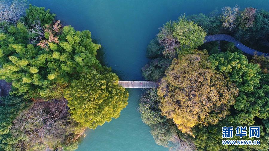 游客通過(guò)湖南烈士公園年嘉湖湖面一座小橋(11月25日無(wú)人機(jī)拍攝)。新華社記者 李尕?cái)z