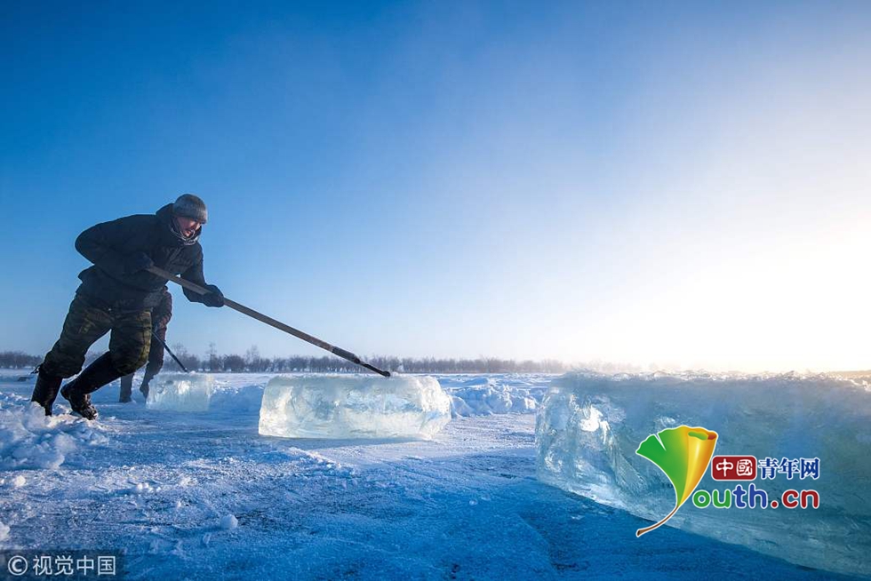 當?shù)貢r間2018年11月27日,雅庫茨克,零下41攝氏度左右的氣溫下,村民在當?shù)氐囊粋€湖中采集冰塊。當?shù)睾芏嗳艘蕾囉谌诨鶋K解決供水,因為多年凍土覆蓋地區(qū)冬季氣溫極低,沒有其他的方式供應(yīng)水。