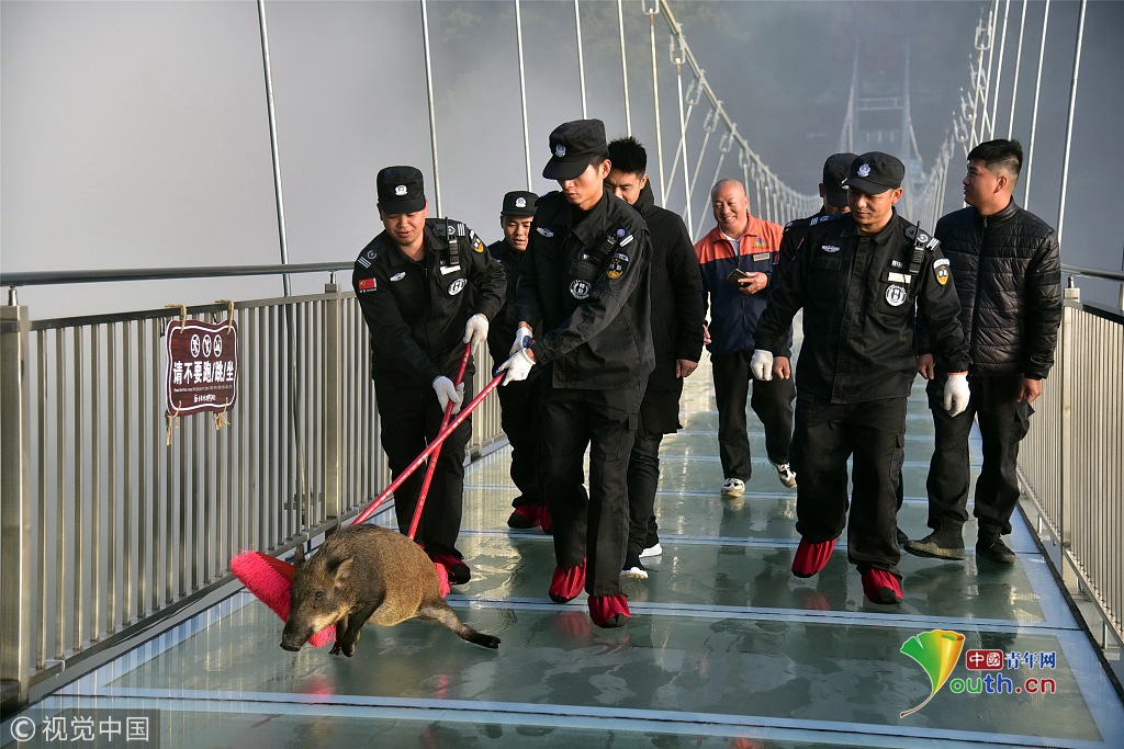 2018年11月29日,一只山豬誤入廣東清遠(yuǎn)古龍峽云天玻霸玻璃橋,結(jié)果被嚇得趴在橋面上發(fā)抖,幾名值班保安齊心協(xié)力將山豬從玻璃橋上解救出來,將其送回森林。