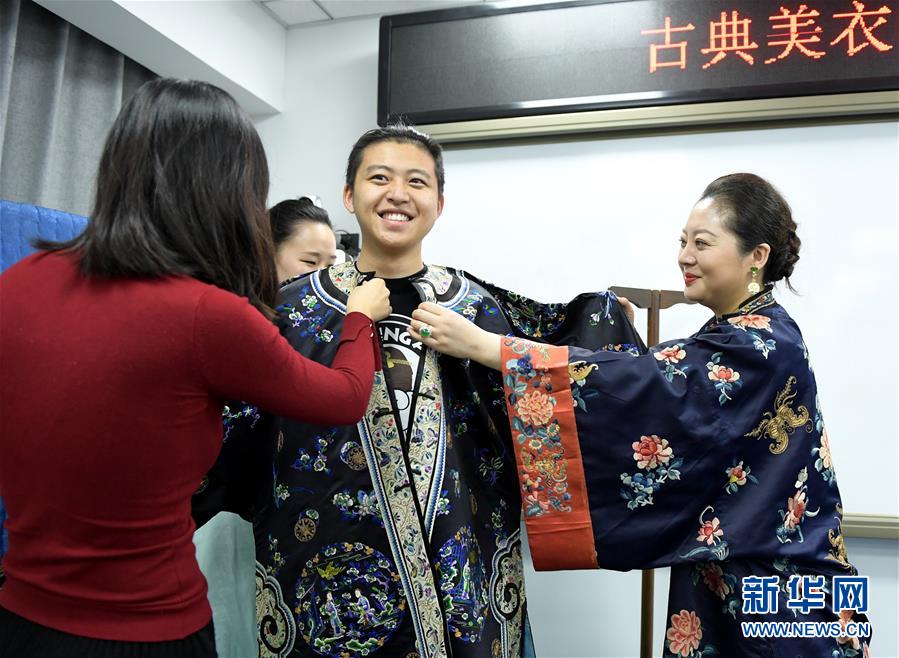 11月30日,在北京服裝學院,在畢紅(右)的邀請下,一名大學生試穿清代團花刺繡服裝。 新華社記者李賀攝