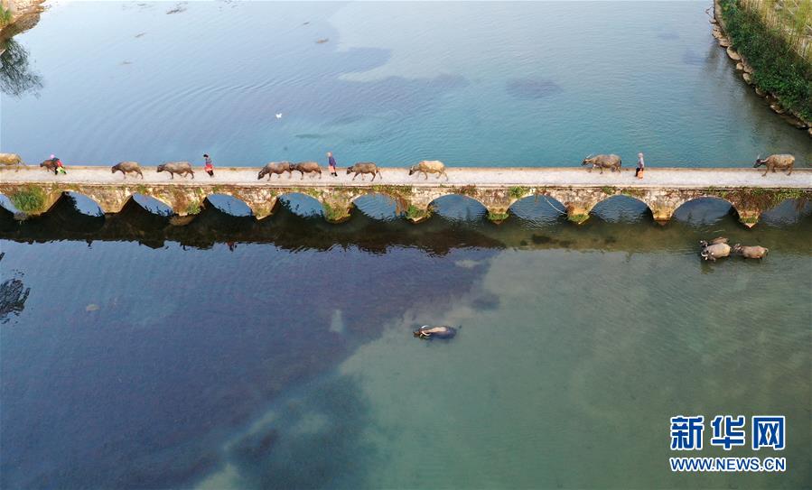廣西百色靖西市新靖鎮(zhèn)鵝泉村村民從古老的石橋上趕?;卮澹?1月27日無人機(jī)拍攝)。