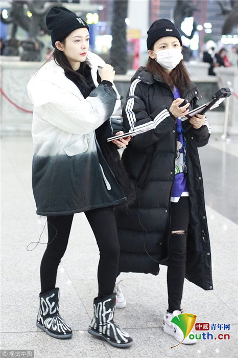 2018年12月3日,北京,“火箭少女101”全體成員現(xiàn)身機場前往國外錄制團總綜。其中孟美岐戴著墨鏡,一身全黑運動裝扮,大步流星氣場超強,楊蕓晴、yamy、楊超越等成員緊隨其后,大家還一起在機場玩起自拍,好不歡樂。