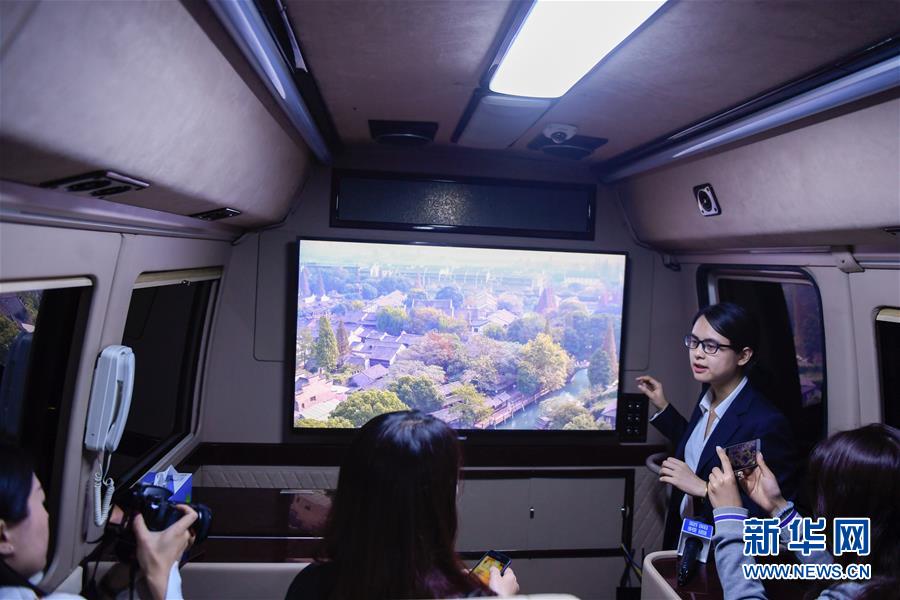 在浙江移動烏鎮(zhèn)分水墩營業(yè)廳外,工作人員在一輛體驗(yàn)巴士內(nèi)介紹通過5G移動傳輸技術(shù)實(shí)現(xiàn)的8K高清的視頻畫面實(shí)時(shí)展示(10月30日攝)。 新華社記者黃宗治攝