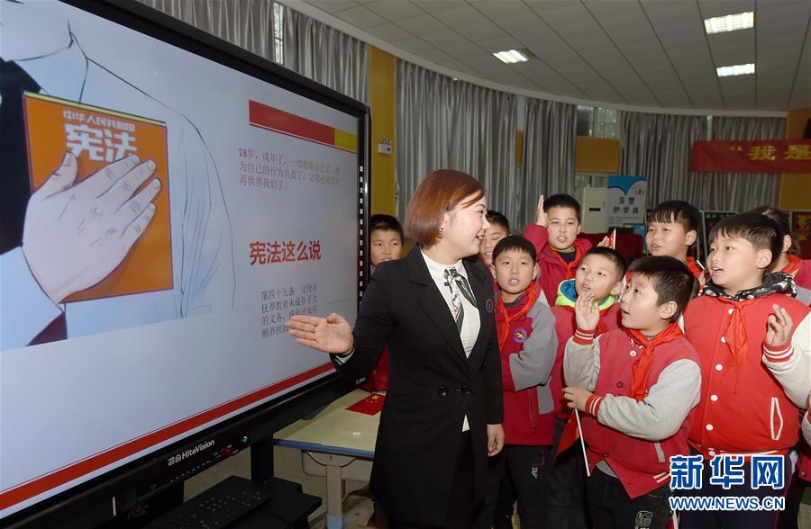 12月3日,合肥市經(jīng)開區(qū)明珠居委會(huì)法律援助律師在給明珠小學(xué)的學(xué)生們講解憲法知識(shí)。國家憲法日到來之際,各地學(xué)校紛紛舉辦主題宣講活動(dòng),對(duì)學(xué)生開展法治教育,幫助孩子們了解憲法知識(shí)。新華社記者 郭晨 攝