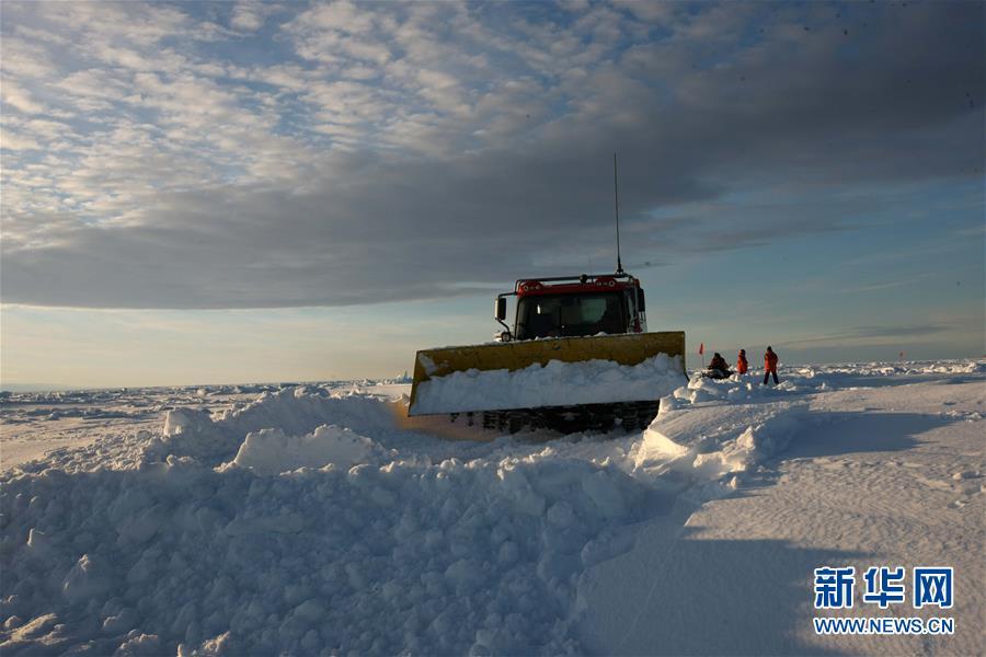 修路小組成員用雪地車裝備的鏟斗推平積雪(12月1日攝)。 搭載中國第35次南極科考隊的“雪龍”號極地考察船日前到達距離中山站44公里處的陸緣冰區(qū),準備迎來本次南極科考首場攻堅戰(zhàn)——物資卸運。一支探冰小組隨即展開海冰探路,以期盡快打通從“雪龍”號到中山站的冰上運輸線,盡早啟動冰上運貨。 新華社記者 劉詩平 攝