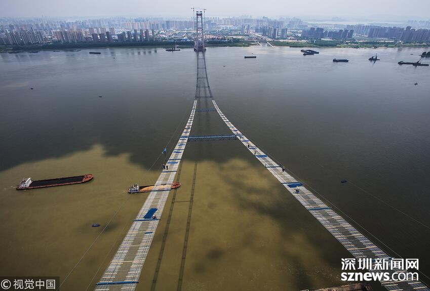 2018年5月14日,武漢,武漢楊泗港長江大橋上空,上部結(jié)構(gòu)施工進入貓道面網(wǎng)鋪設(shè)階段,數(shù)十名中鐵大橋局工人在跨江高空拼搏趕超,江面上空的臨時“吊橋”悄然形成。數(shù)十名工人在長江上空228米處拼搏趕超,臨時“天梯”悄然形成。
