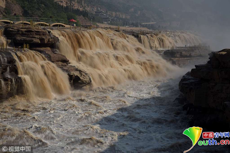 5月31日,山西臨汾奔騰咆哮的黃河壺口瀑布吸引游客。近日,受上游地區(qū)降雨量增多影響,黃河干流晉陜峽谷水量大增,每秒流量達(dá)到1100立方,是常年同期的三倍,壺口瀑布出現(xiàn)五月份罕見的瀑布群景觀,吸引了眾多游客。