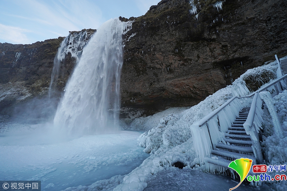 近日,冰島的塞里雅蘭瀑布在零下12攝氏度的氣溫下結(jié)冰,畫(huà)面彷如天外仙境。圖片來(lái)源:視覺(jué)中國(guó)