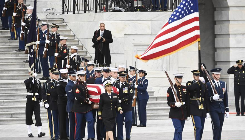 當(dāng)?shù)貢r(shí)間2018年12月5日,美國(guó)華盛頓,美國(guó)國(guó)家大教堂舉行第41任總統(tǒng)老布什葬禮,美國(guó)現(xiàn)任和前任總統(tǒng)出席儀式,特朗普全程和克林頓夫婦無(wú)交流,僅與奧巴馬握了手。據(jù)美媒揭露,特朗普自2017年1月上任以來(lái),從未與奧巴馬或克林頓夫婦交談。